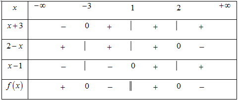 Cho biểu thức \(f\left( x \right) = \frac{{\left( {x + 3} \right)\left( {2 - x} \right)}}{{x - 1}}.\) Tập hợp tất cả các giá trị của x thỏa mãn bất phương trình f(x) > 0 là