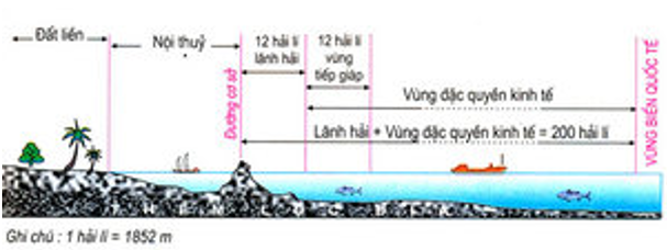 - Lãnh hải: vùng biển có chiều rộng 12 hải lí, tính từ đường cơ sở ra phía biển. Ranh giới phía ngoài của lãnh hải được coi là đường biên giới quốc gia trên biển.