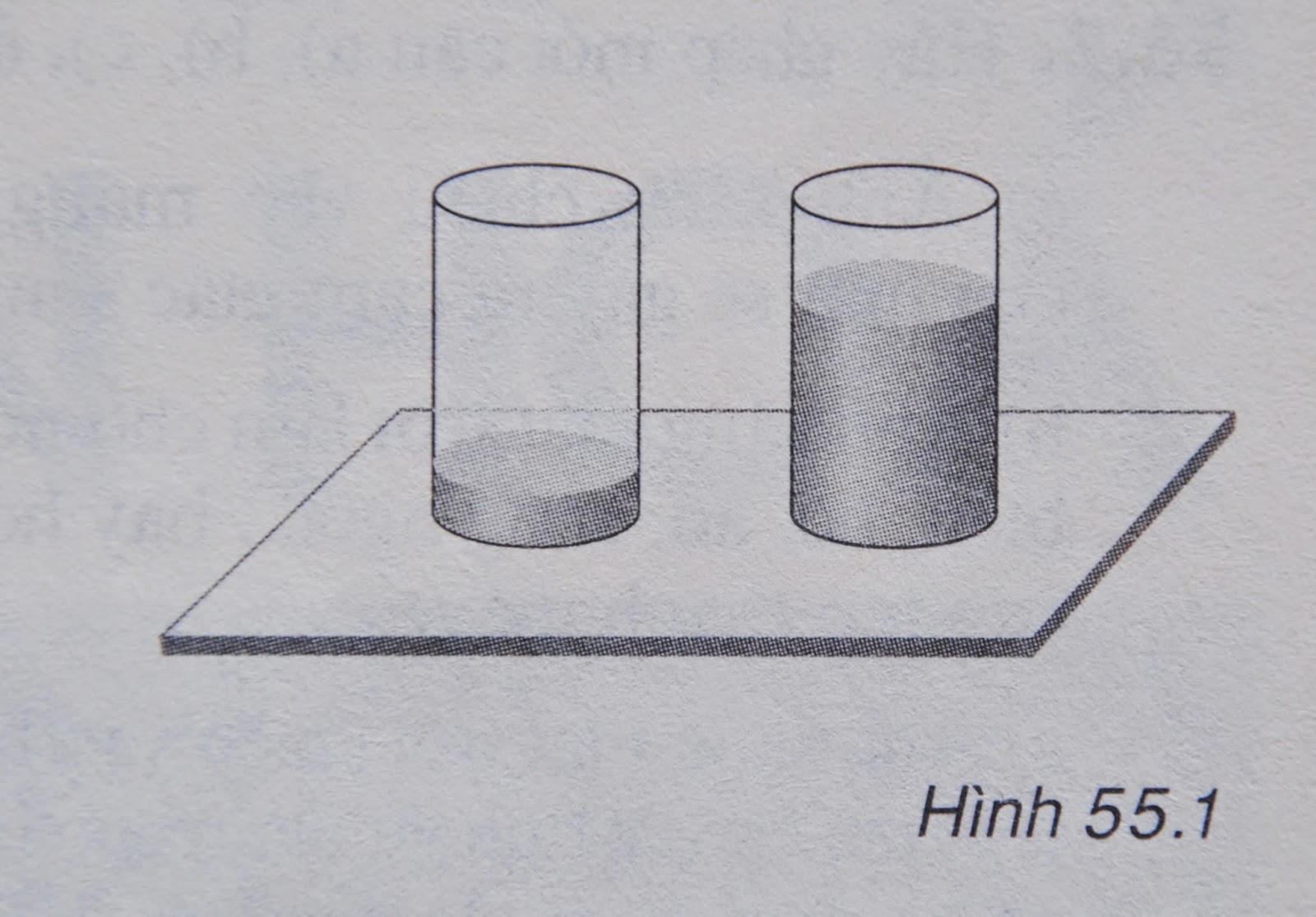 Pha một ít nước mực xanh loãng rồi đổ vào hai cốc thủy tinh như nhau, đáy trong suốt; một cốc đổ rất vơi, một cốc đổ khá đầy. Đặt hai cốc trên một tờ giấy trắng.