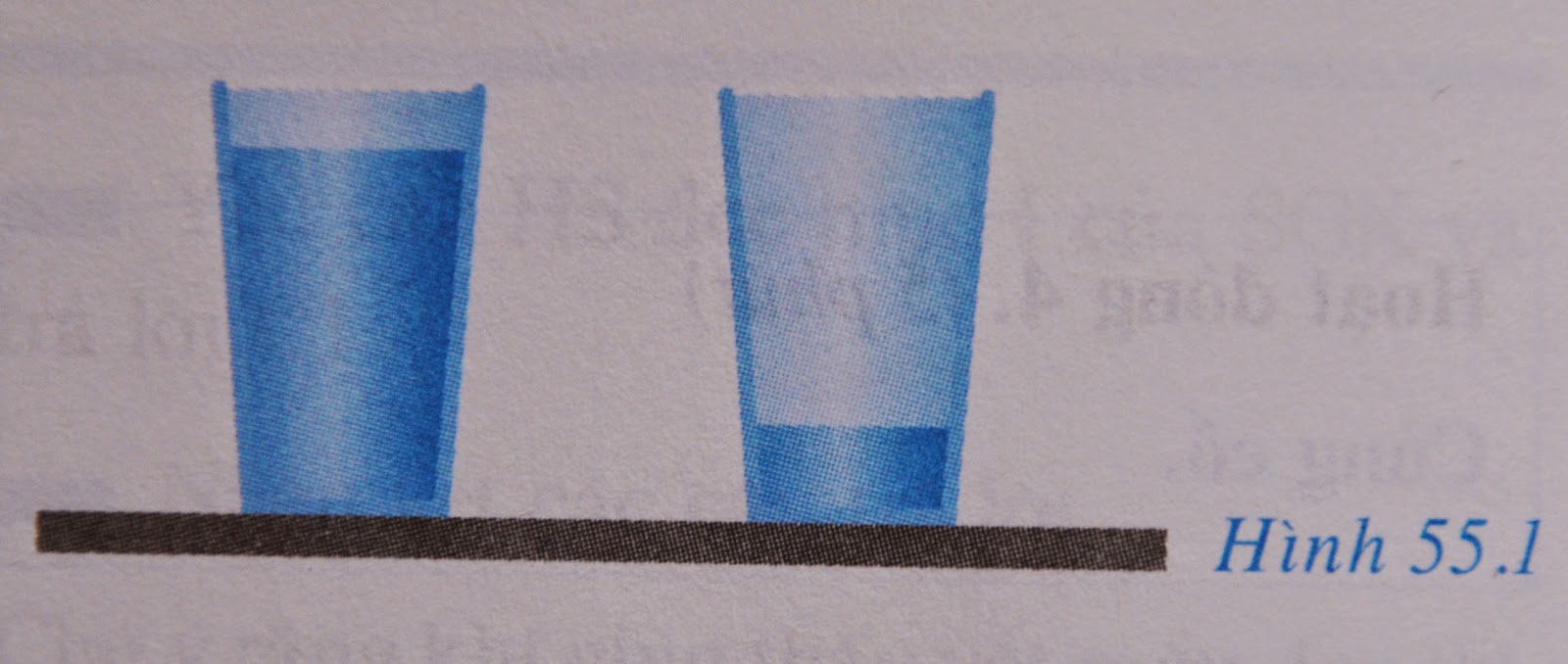 Nếu nhìn theo phương thẳng đứng thì ta sẽ thấy nước ở trong chiếc cốc đầy sẽ xanh hơn nước ở trong chiếc cốc vơi (hình 55.1)